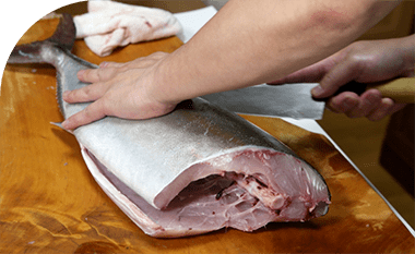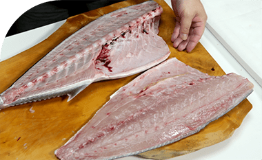 尻尾とつながっている部分を切り離します。半身をおろせたら、もう片方の半身も同じようにおろして三枚おろしは完了です。