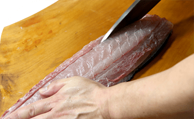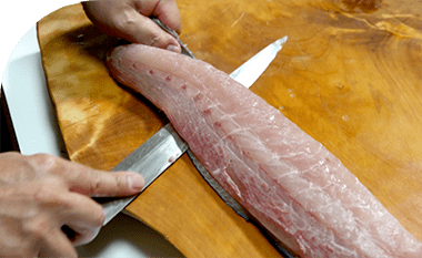 中央部分には小骨が入っているので、その部分を切り落とします。なるべく身をたくさん切り落とさないように骨の位置を気をつけながら切っていきます。
